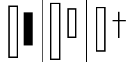 上昇局面で出現した長い陽線の翌日の、上ヒゲの短い陽・陰線が天井を表します。また短い陽・陰線の寄引同時線は宵の十字星です。 |