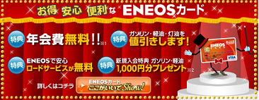 ENEOS(エネオス)カードは、新日本石油とニコスとの提携で生まれたクレジットカードです。このENEOS(エネオス)カードには、ENEOSロードサービスが付いています。ご入会後、ENEOSサービスステーションにてガソリン・軽油をENEOSカードでご購入いただくと、ご請求時に1,000円分ご請求いたしません。尚、有効期間は1年間となります。
